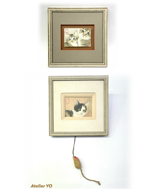 猫が題材になった水彩画2点の額装です。