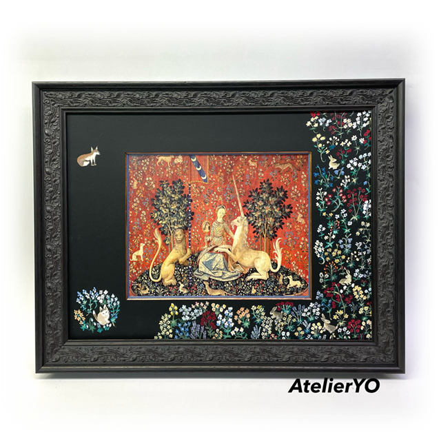 静けさの中で美しく輝いていた中世の大タペストリーを思い出しながら、黒い紙で貼り込んだマットに細かな花や動物たちを描きました。左端には愛猫も忍ばせています。