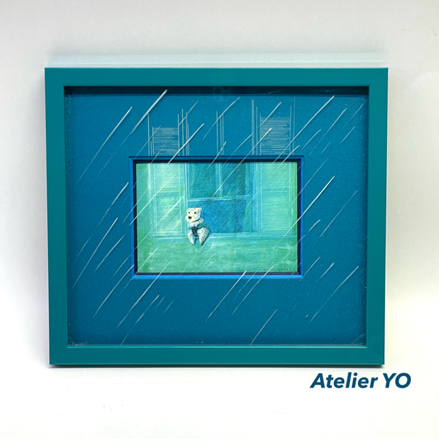 二重に重ねたマットを仕立て、ワンコがもたれかかっている窓枠を延長するように描き足しました。さらに少し浮かせたアクリルガラスの裏から雨脚も加えて立体的に仕上げています。早く雨が上がってお散歩に行けるといいですね。
