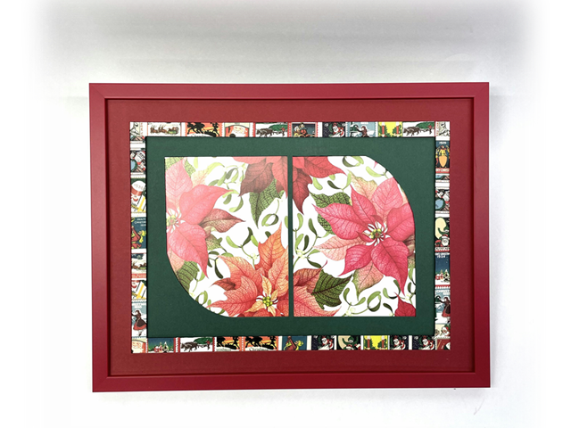 二つ窓でそれぞれを葉っぱのような形に作ったグリーンのマットの上に、クリスマス図案の切手がプリントされた化粧紙で貼り包んだマットを重ね、さらに赤い生地のマットをと、三重重ねの奥行きある作品です。今年のクリスマスのために早めの準備!