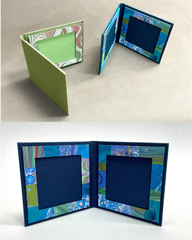 ハガキ大の写真やカードを収納するための紙ばさみに蛇腹のマチを付け、両面にフレームを付けたスタイルです。紙芝居のようにスライドさせてカードを入れ替えて飾ります。