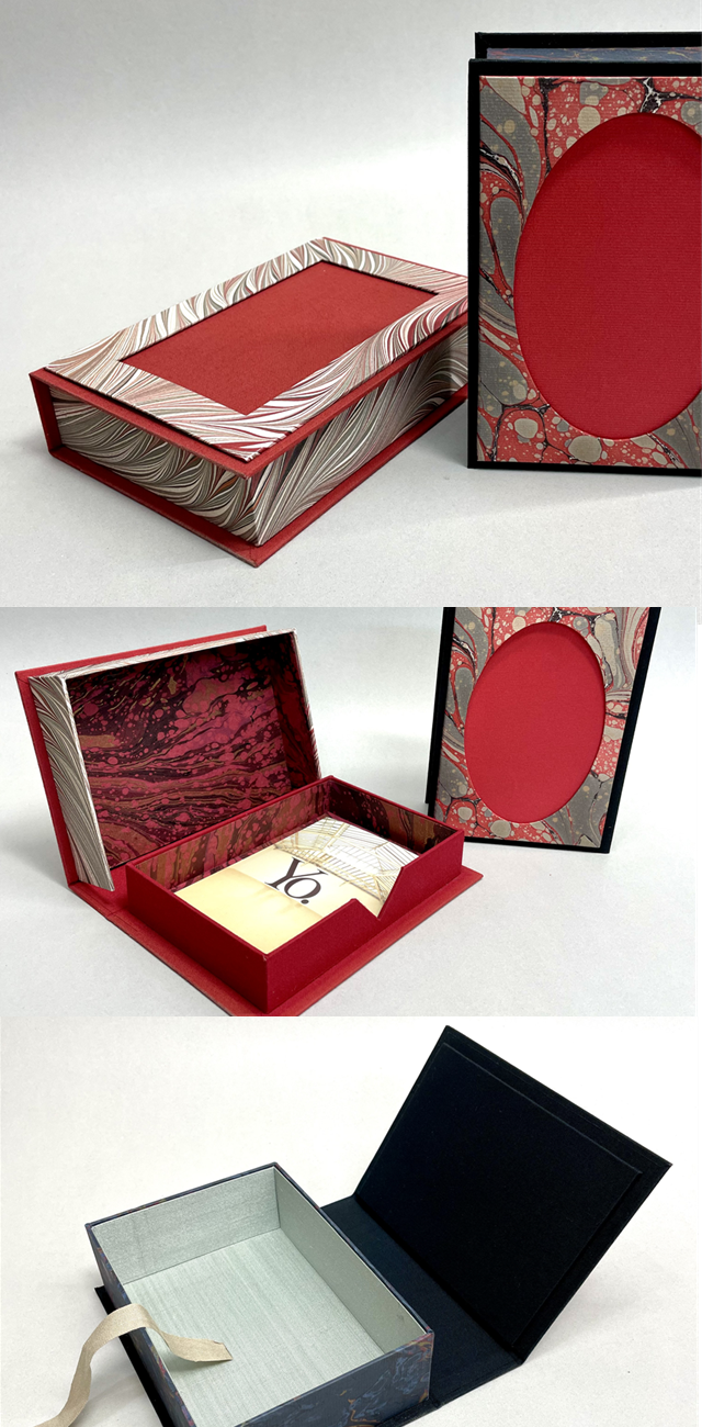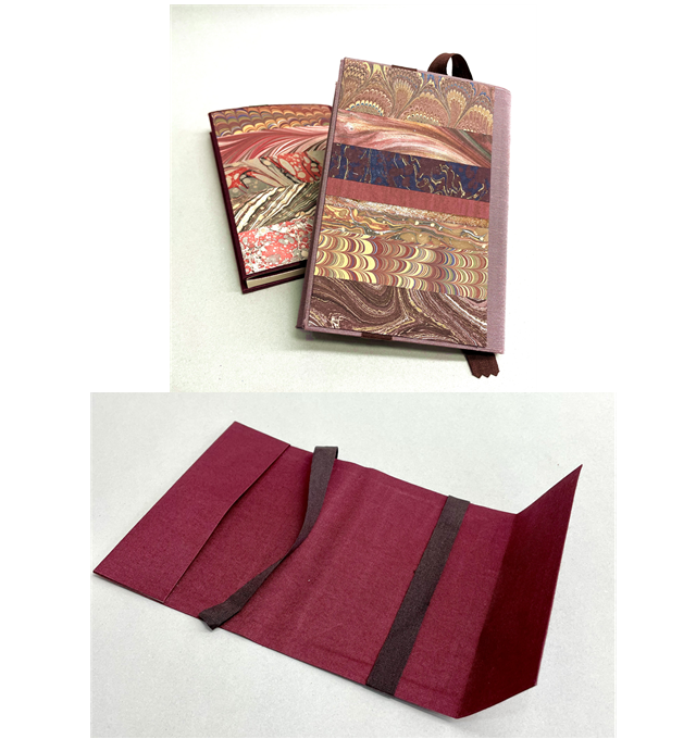 額装に使用する生地(麻や周布、シルク等)は丈夫な薄紙で裏打ちされています。その端切れを切り貼りして文庫本カバーを仕立てました。厚紙は使わず、裏打ち生地、リボン、マーブル紙を組み合わせて糊を使って作ります。しなやかで軽く、移動の途中やカフェでの読書タイムを心豊かにしてくれます。