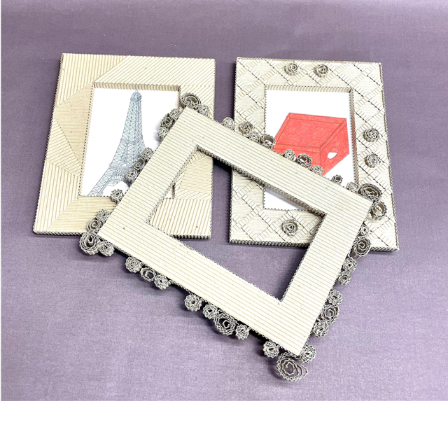 柔らかく柔軟性に富む片面段ボールは、その特性を生かして様々なデザインのフレームを作ることが可能です。軽く丈夫で(我が家では20年飾っています!)細いピンや両面テープなどで壁に固定出来るのもその魅力の一つです。