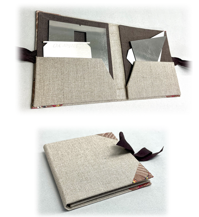 額装作業に使う金属の型定規を纏める小さなホルダーです。額装の材料の余った布や紙、糊を使って作ります。サイズや厚みを応用すると色々なものが入れられそうです。