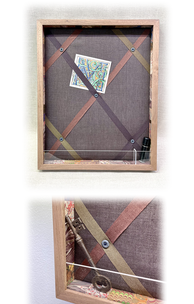 奥行きのあるブラックウォールナットのフレームにメモや写真などを挟むことが出来るリボンがクロスするデザインです。