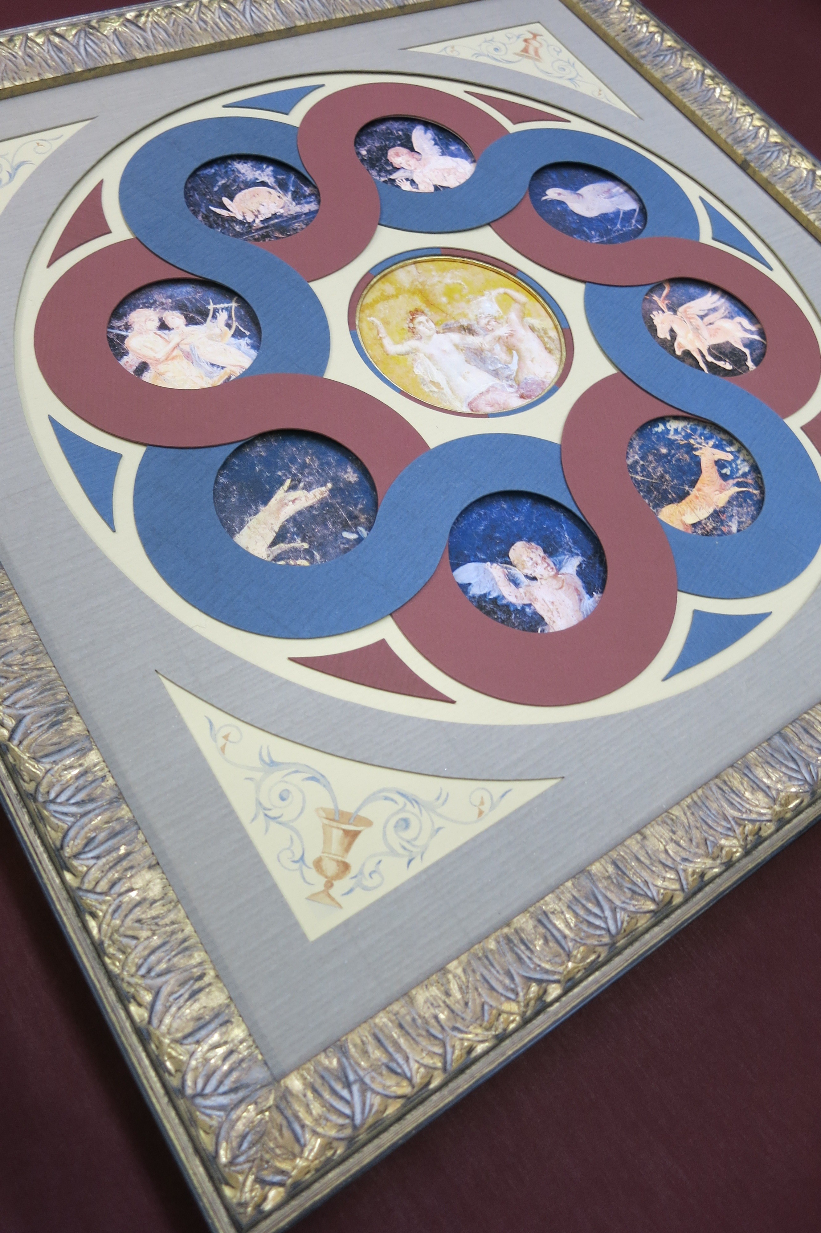 ヨーロッパのアンティーク版画や水彩画などによく似合い、作品の古び具合に応じてマット全体に粉を掛けて色調を調整します。